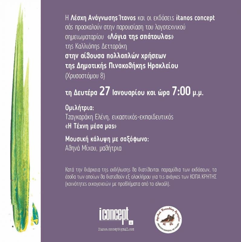 Αίθουσα πολλαπλών χρήσεων Δημοτικής Πινακοθήκης Ηρακλείου – Χρυσοστόμου 8, Ηράκλειο . Ώρα έναρξης: 19:00, Είσοδος Ελεύθερη