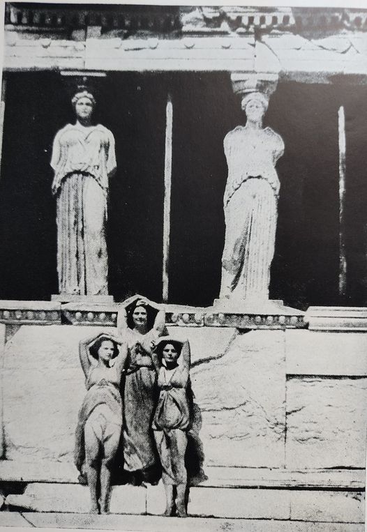 Μία από αυτές, που την εμφανίζω εδώ, δημοσιεύτηκε στο λεύκωμα “Isadora Duncan, London 1948”. Εικονίζεται η περίφημη χορεύτρια στον Παρθενώνα, το 1920, ανάμεσα σε δύο μαθήτριες της.