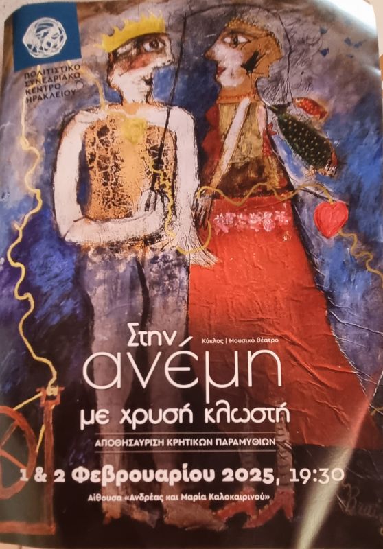Στον νέο κύκλο, μουσικό θέατρο, «Στην ανέμη με χρυσή κλωστή», αποθησαύριση Κρητικών παραμυθιών, 1&2 Φεβρουαρίου στις 7:30 το απόγευμα στην αίθουσα του Πολιτιστικού Κέντρου Ηρακλείου, «Ανδρέας και Μαρία Καλοκαιρινού», θα έχουμε την μεγάλη ευκαιρία να απολαύσουμε ένα μοναδικό θέαμα όπου παραμύθια του σπουδαίου δασκάλου και λαογράφου Αριστοφάνη Χουρδάκη παίρνουν σάρκα και οστά επί σκηνής! Θα είμαστε όλοι εκεί!