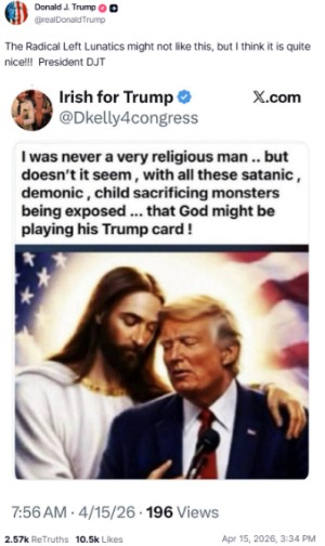 Υπενθυμίζεται πως ο Ντόναλντ Τραμπ είχε δημοσιεύσει μία εικόνα που είχε δημιουργηθεί με τεχνητή νοημοσύνη και τον απεικόνιζε ως τον Ιησού να θεραπεύει έναν άρρωστο άνδρα με ακτίνες φωτός να εκπέμπονται από τα χέρια του. Ο Τραμπ εμφανίζεται περιτριγυρισμένος από πατριωτικά σύμβολα, όπως μια κυματίζουσα αμερικανική σημαία, το Άγαλμα της Ελευθερίας και αετοί που πετούν πάνω από το κεφάλι του. Η συγκεκριμένη ανάρτηση προκάλεσε αντιδράσεις και διαγράφηκε από το Truth Social.