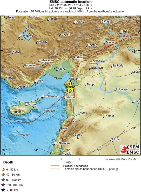 Το επίκεντρο της δόνησης εντοπίστηκε σε απόσταση 9 χλμ. νοτιοανατολικά της Αντάκειας στην Τουρκία και 75 χλμ. της Λατάκιας στη Συρία.