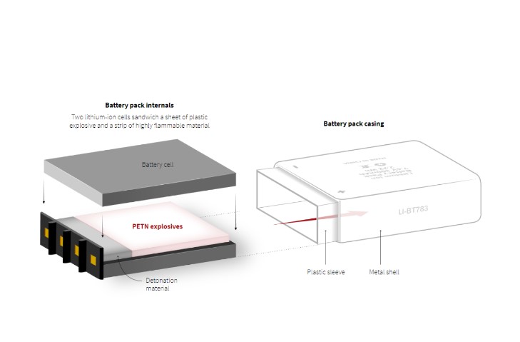 Επιπλέον το Ισραήλ όπως φαίνεται και στο παρακάτω γράφημα τοποθέτησε ως επιταχυντή μία εξαιρετικά εύφλεκτη πλαστική ύλη ανάμεσα στα εκρηκτικά και τους δύο πόλους της μπαταρίας.