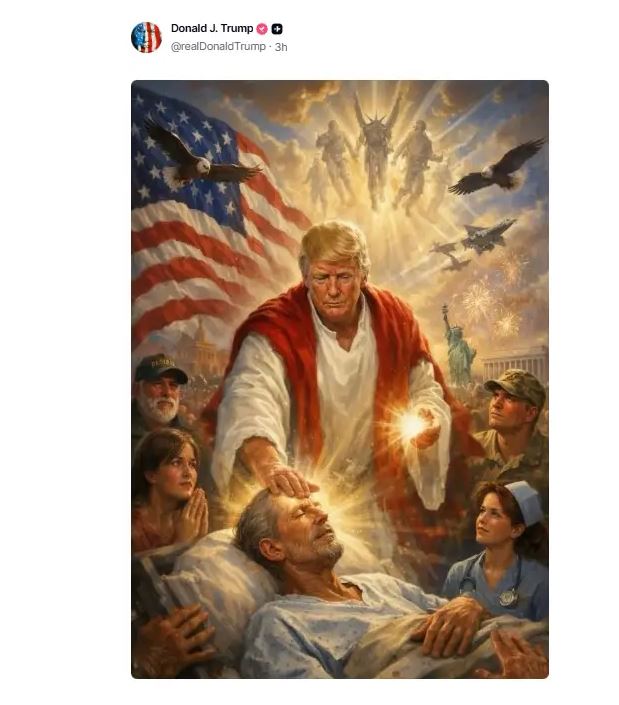 Ο ρεπουμπλικάνος σχεδόν ταυτόχρονα ανέβασε εικόνα δημιουργημένη από κάποιο εργαλείο τεχνητής νοημοσύνης στην οποία παρουσιάζεται, με λευκή και κόκκινη τήβεννο, να βάζει το χέρι στο μέτωπο αρρώστου, κλινήρη στο νοσοκομείο, πλαισιωμένος από ανθρώπους που προσεύχονται ή κάτι προσμένουν, και στο φόντο αμερικανική σημαία, το Άγαλμα της Ελευθερίας, καταδιωκτικά, αετούς και άλλες μορφές.