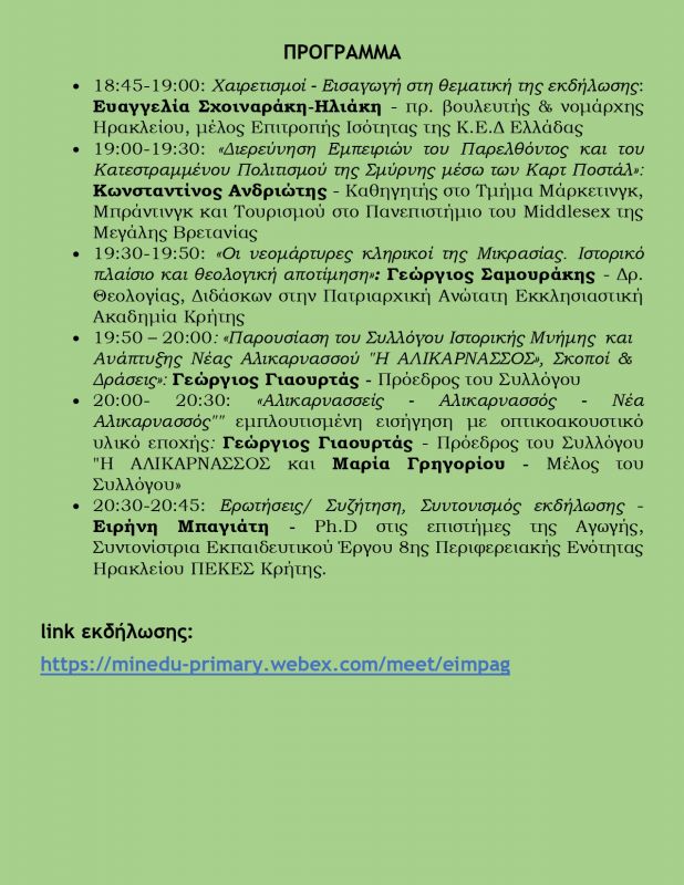 Η Συντονίστρια Εκπαιδευτικού Έργου κλάδου ΠΕ70 Δρ. Μπαγιάτη Ειρήνη, επιστημονικά και παιδαγωγικά αρμόδια των σχολικών μονάδων 8ης Ενότητας Ηρακλείου ΠΕ.Κ.Ε.Σ. Κρήτης, σε συνεργασία με το Σύλλογο Ιστορικής Μνήμης και Ανάπτυξης Νέας Αλικαρνασσού "Η ΑΛΙΚΑΡΝΑΣΣΟΣ" διοργανώνουν διαδικτυακή εκδήλωση με θέμα: «100 ΧΡΟΝΙΑ ΑΠΟ ΤΗ ΜΙΚΡΑΣΙΑΤΙΚΗ ΚΑΤΑΣΤΡΟΦΗ 1922» τη Δευτέρα 23 Μαΐου 2022 και ώρες 18:45΄ έως 20:45΄.