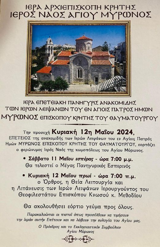 Αύριο Κυριακή 12η Μαΐου 2024, επέτειος της ανακομιδής των Ιερών Λειψάνων του Αγίου Μύρωνος Επισκόπου Κρήτης του θαυματουργού εορτάζει ο φερώνυμος Ιερός Ναός στον Άγιο Μύρωνα έξω από το Ηράκλειο.