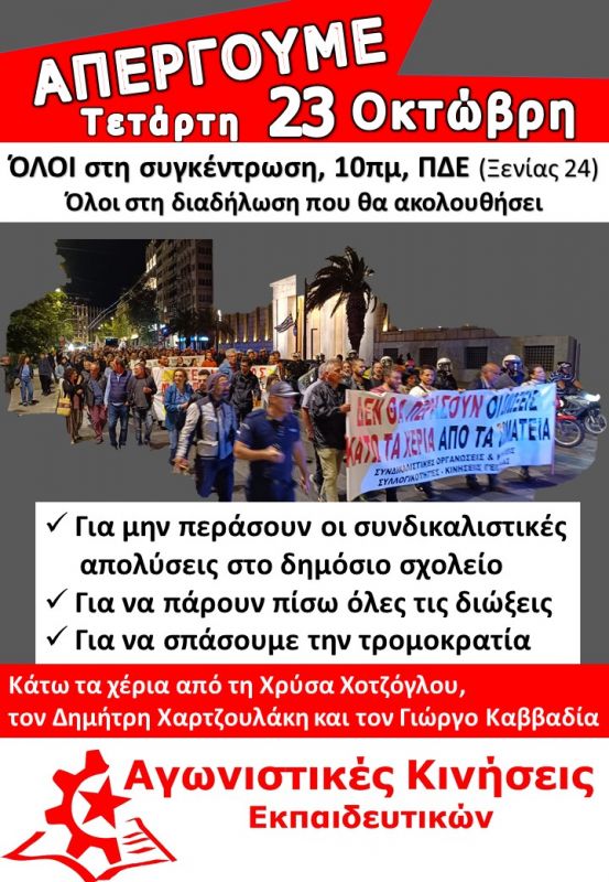 Την Τετάρτη 23/10 η Χρύσα Χοτζόγλου και ο Γιώργος Καββαδίας αλλά και όλοι οι εκπαιδευτικοί δεν θα σκύψουν το κεφάλι! Με το κεφάλι ψηλά μαζί με το λαό και νεολαία να βάλουμε φραγμό στον αυταρχισμό και την τρομοκρατία! Με αγώνες να υπερασπιστούμε τη δημόσια δωρεάν παιδεία, τους μαθητές, τη δουλειά μας, τις ζωές μας! Ο αγώνας να συνεχιστεί και να κλιμακωθεί με απεργίες, συνελεύσεις, διαδηλώσεις μέχρι να παρθούν πίσω ΟΛΕΣ ΟΙ ΔΙΩΞΕΙΣ πειθαρχικές και ποινικές! Οι πρώτες απολύσεις από το δημόσιο σχολείο για συνδικαλιστική δράση ΔΕΝ ΘΑ ΠΕΡΑΣΟΥΝ! Κι αυτό ΕΙΝΑΙ ΥΠΟΘΕΣΗ ΟΛΩΝ ΜΑΣ!