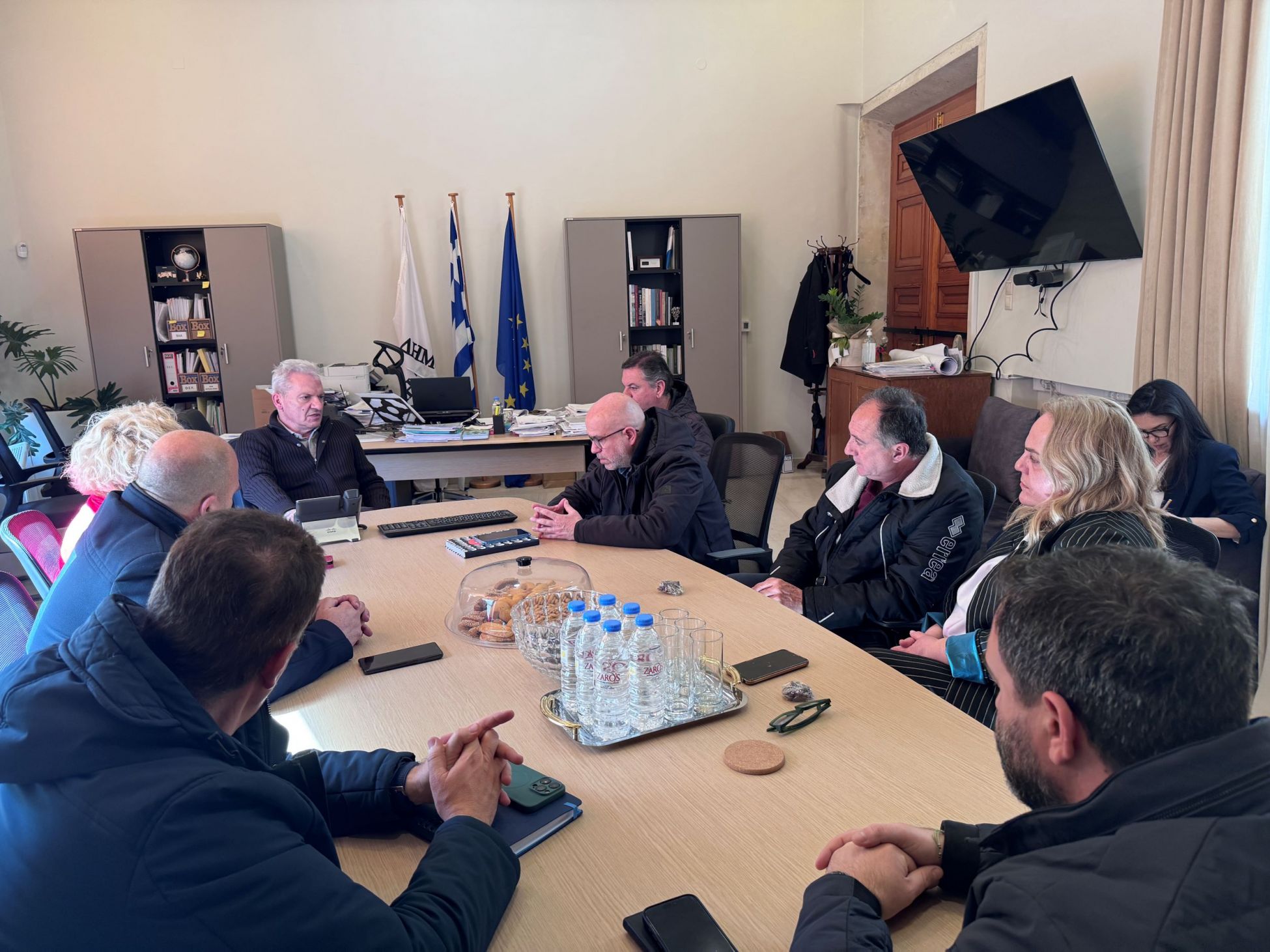 Συνάντηση με εκπροσώπους της ΑΔΕΔΥ και του Συλλόγου Εργαζομένων του Δήμου Ηρακλείου είχε ο Δήμαρχος Ηρακλείου Αλέξης Καλοκαιρινός τη Δευτέρα 17/2 στο γραφείο του στη Λότζια, στην οποία συμμετείχαν επίσης οι Αντιδήμαρχοι Τεχνικών Υποδομών και Βιώσιμης Κινητικότητας Γιώργος Σισαμάκης και Διοίκησης, Αποκέντρωσης & Ανάπτυξης της Υπαίθρου Γιάννα Καλονάκη.