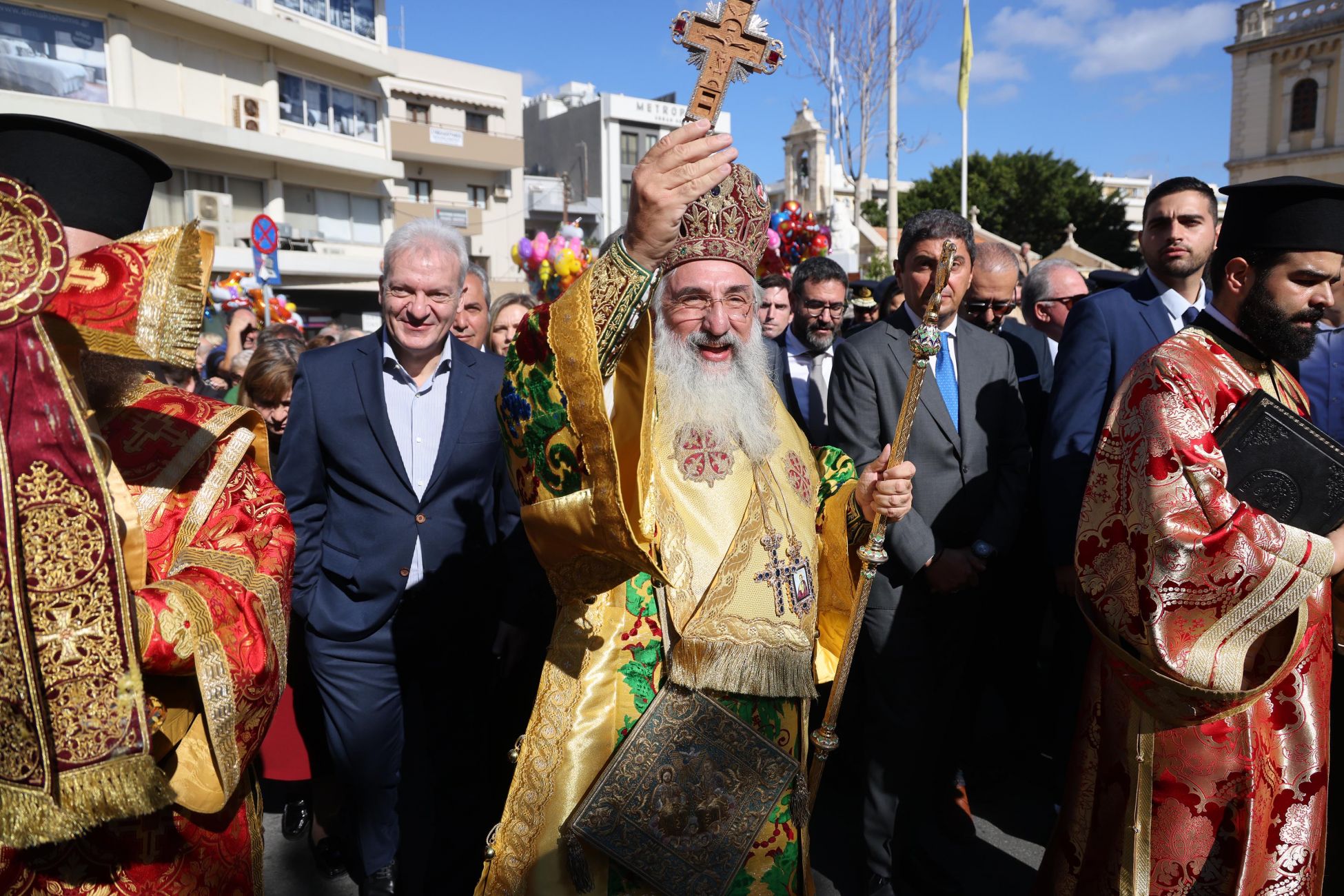 «Χρόνια πολλά Ηράκλειο, χρόνια πολλά στις Ηρακλειώτισσες και στους Ηρακλειώτες και σε όσους βρίσκονται μαζί μας εδώ, και είναι πολλοί σήμερα, στον Καθεδρικό Ναό του Αγίου Μηνά. Πολλοί – πολλοί άνθρωποι. Αυτό κάτι σημαίνει. Σημαίνει ότι υπάρχει η αίσθηση της κοινότητας, εδώ, στον τόπο αυτό. Και νομίζω ότι αξίζει τον κόπο, αυτή την κοινότητα που είναι τόσο ζωντανή, να την έχουμε ενεργή όχι μόνο σε γιορτές, αλλά και στα έργα τα οποία πρέπει να κάνουμε μαζί και που μόνο αν είμαστε όλοι μαζί θα μπορέσουν να προχωρήσουν. Για τους Ηρακλειώτες σήμερα είναι μια μέρα, κυρίως γιορτής, αλλά και ξεκούρασης. Εύχομαι να περάσουν καλά και εύχομαι κάποια στιγμή να έρθουν και οι βροχές τις οποίες χρειαζόμαστε για να πορευτούμε τους επόμενους μήνες.».
