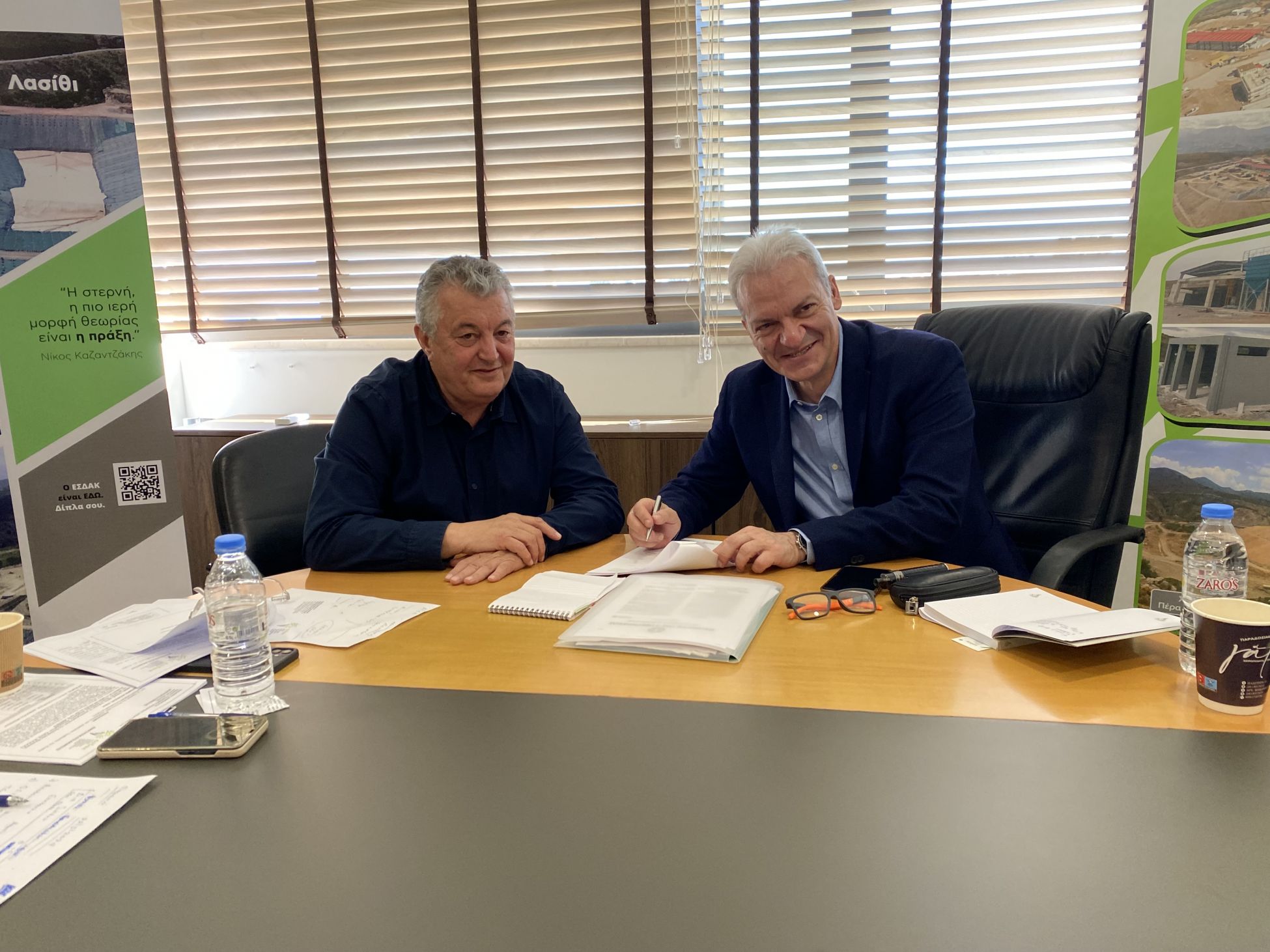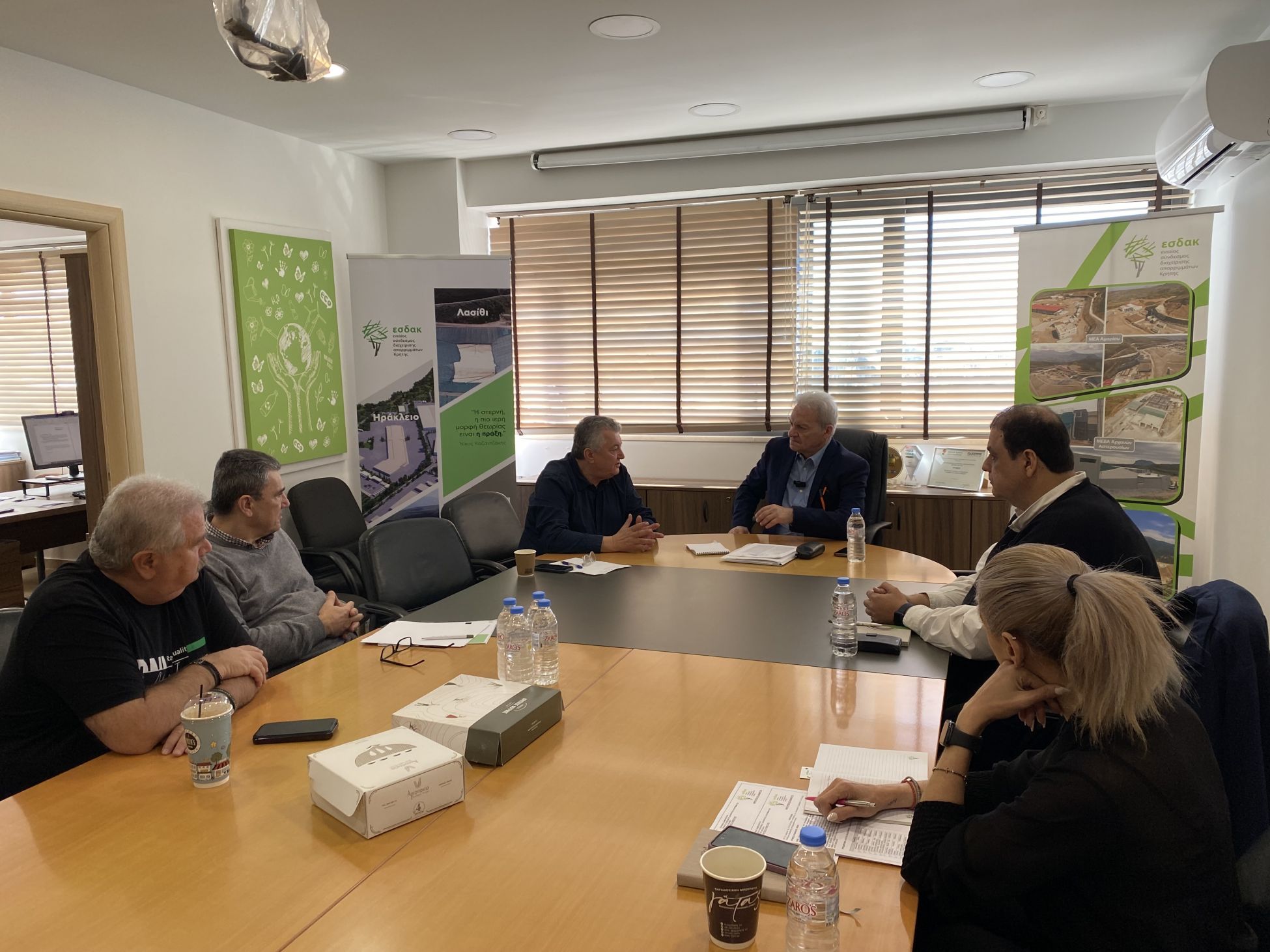 Στην έδρα του Ενιαίου Συνδέσμου Διαχείρισης Απορριμμάτων Κρήτης βρέθηκε το πρωί της Παρασκευής ο Δήμαρχος Ηρακλείου και νέος Πρόεδρος του Συνδέσμου Αλέξης Καλοκαιρινός, για την διαδικασία παράδοσης - παραλαβής από τον απερχόμενο Πρόεδρο Ζαχαρία Καλογεράκη.