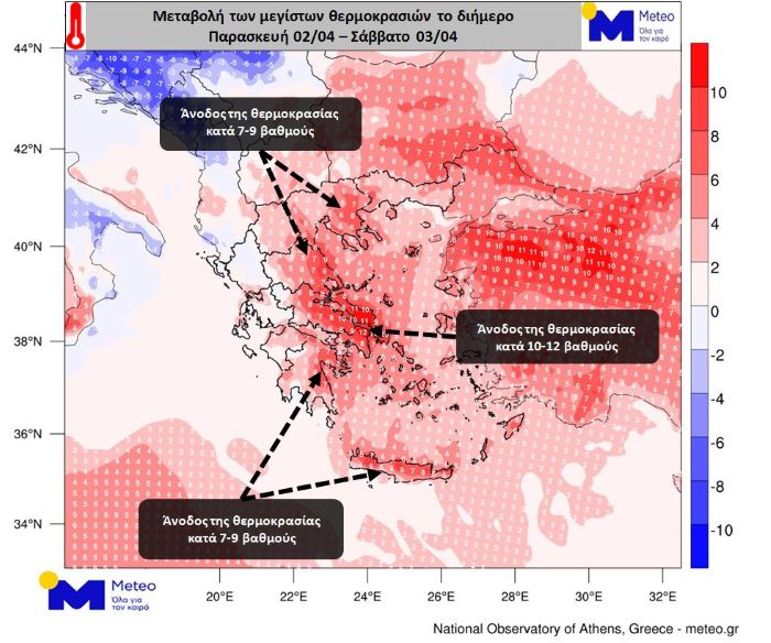 Σύμφωνα με τα προγνωστικά στοιχεία του Εθνικού Αστεροσκοπείου Αθηνών / Meteo.gr, σημαντική άνοδο αναμένεται να παρουσιάσουν οι μέγιστες θερμοκρασίες το διήμερο Παρασκευή 02/04 - Σάββατο 03/04.