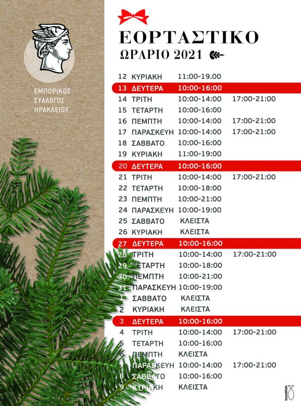 Στο Ηράκλειο με βάση το πρόγραμμα που ανακοίνωσε ο Εμπορικός Σύλλογος τα καταστήματα θα ανοίξουν στις 11 το πρωί και θα κλείσουν στις 7 το απόγευμα. Το ίδιο ωράριο θα ισχύσει στο Ηράκλειο και την ερχόμενη Κυριακή 19 Δεκεμβρίου