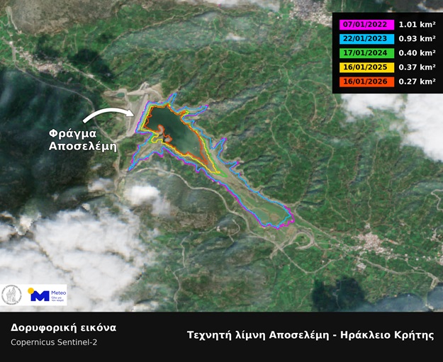Σημαντική και ανησυχητική συρρίκνωση παρουσιάζει η τεχνητή λίμνη του Αποσελέμη, όπως αποτυπώνεται σε δορυφορικά δεδομένα που επεξεργάστηκε η μονάδα ΜΕΤΕΟ του Εθνικού Αστεροσκοπείου Αθηνών, αξιοποιώντας εικόνες από τον ευρωπαϊκό δορυφόρο Sentinel-2.
