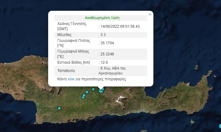 Σεισμική δόνηση 3,3 Ρίχτερ σημειώθηκε στις 12.01 σήμερα το μεσημέρι στην περιοχή του Αρκαλοχωρίου.