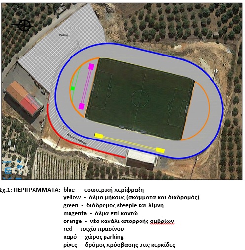 Στο πλαίσιο αυτό πρόκειται να πραγματοποιηθούν οι απαραίτητες εργασίες ασφαλτόστρωσης του περιβάλλοντα χώρου του Σταδίου (παρκινγκ, οδός πρόσβασης στις κερκίδες, επιφάνεια όπου θα επιστρωθεί ο συνθετικός τάπητας στίβου, κλπ), οι κατασκευές - υποδομές που απαιτούνται για τα αθλήματα αλμάτων (μήκους, ύψους και επί κοντώ) και δρόμου με φυσικά εμπόδια (steeple), καθώς και οι εργασίες για την απορροή των ομβρίων.