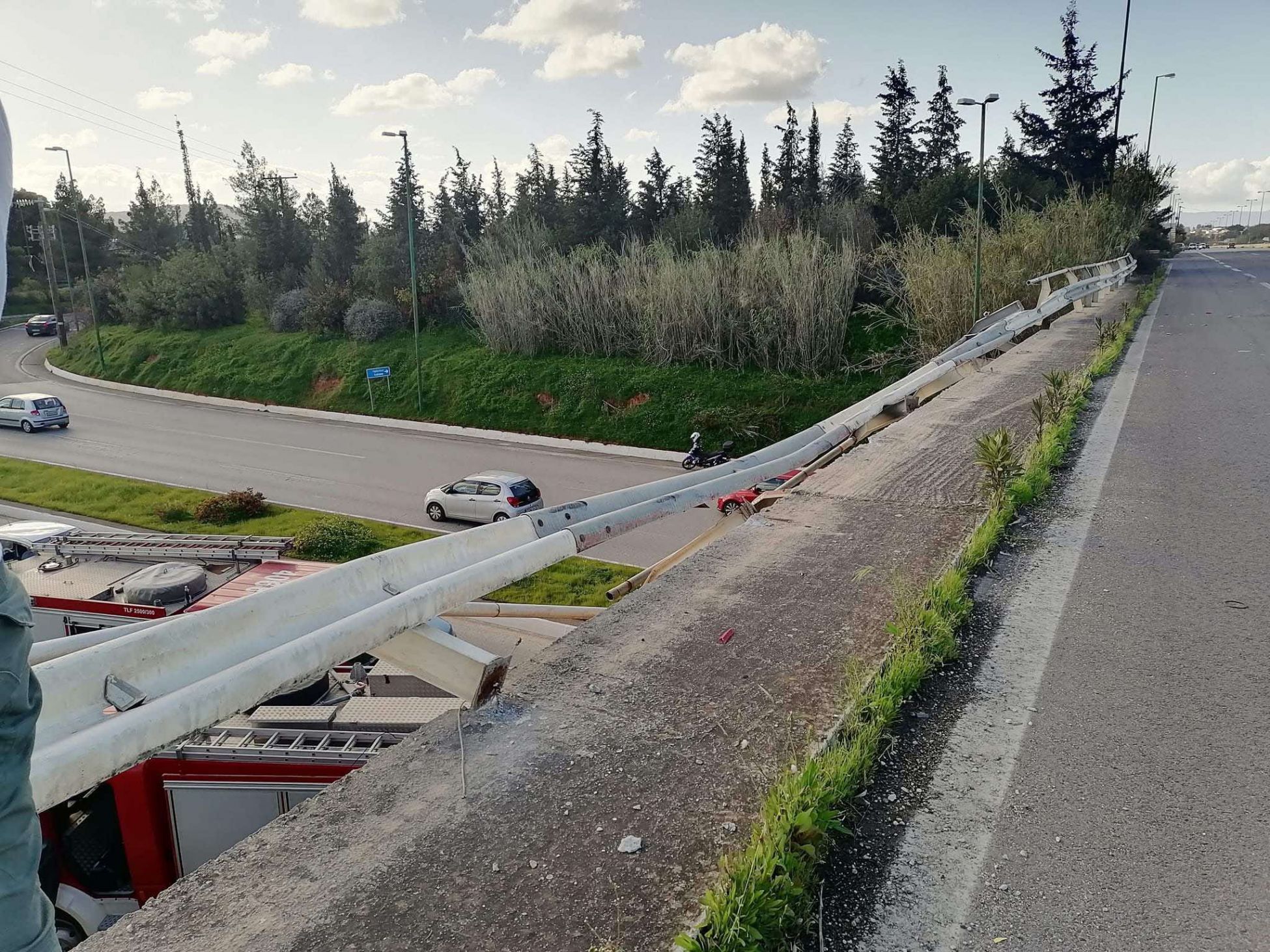 Απίστευτο τροχαίο σημειώθηκε το μεσημέρι της Παρασκευής, όταν ένα επαγγελματικό όχημα ξέφυγε από την πορεία του, έσπασε τις προστατευτικές μπάρες του ΒΟΑΚ και έπεσε από τη γέφυρα στον κόμβο των Μουρνιών.