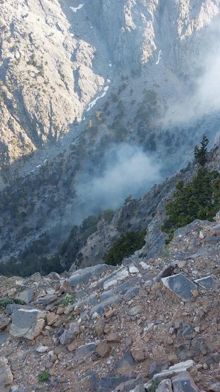 Λόγω του δύσβατου της περιοχής δεν μπορούν να προσεγγίσουν τα πυροσβεστικά οχήματα.