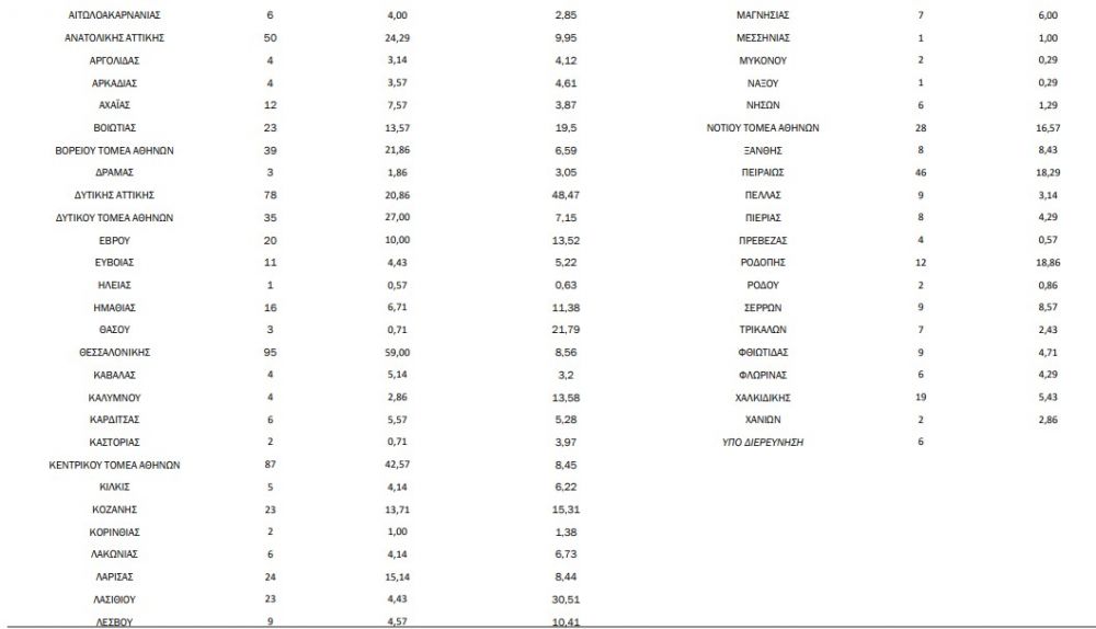 Δείτε και τη λίστα του ΕΟΔΥ με τη γεωγραφική εξάπλωση του κορωνοϊού στην χώρα μας. Στην πρώτη στήλη φαίνονται τα σημερινά κρούσματα, στη δεύτερη ο μέσος όρος κρουσμάτων τις τελευταίες 7 ημέρες και στην τρίτη ο μέσος όρος ανά 100.000 κατοίκους