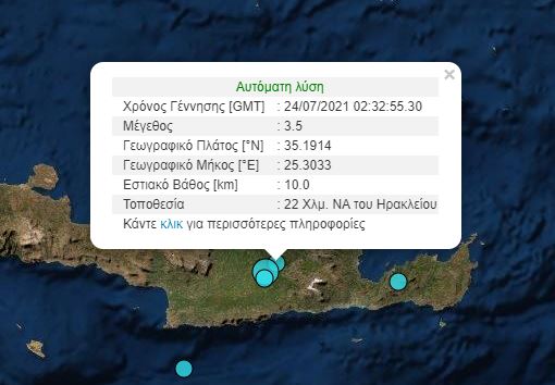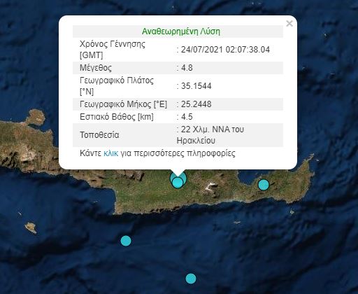 Το επίκεντρο εντοπιζεται στα στα 22 χμ ΝΝΑ του Ηρακλείου και το εστιακό Βάθος του μόλις 4,5 χμ