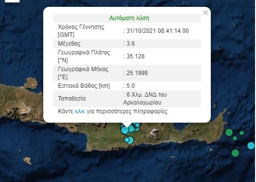Στις 10.41 το πρωί καταγράφηκε δόνηση 3,6 Ρίχτερ με επίκεντρο σύμφωνα με το Γεωδυναμικό Ινστιτούτο την περιοχή 6 χιλ ΔΝΔ του Αρκαλοχωρίου (πρώτη εκτίμηση)