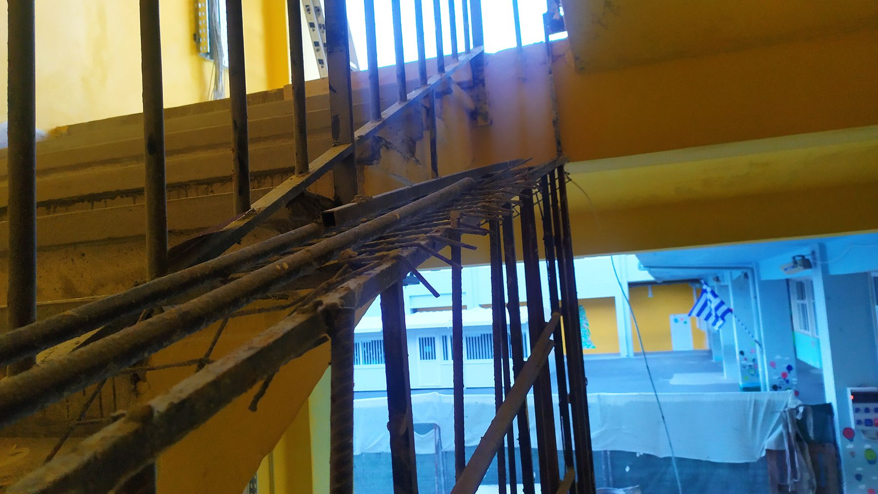 Για όλα αυτά η Τεχνική Υπηρεσία βολεύεται πίσω από το αφήγημα ότι «δεν ήταν στη σύμβαση», θεωρώντας π.χ. ότι θα μπορούσε να παραδώσει σχολείο με τα σίδερα να χάσκουν στη σκάλα και να αποτελούν παγίδα ατυχήματος για τα παιδιά μας (βλ. σχετικές φωτό). Για το θέμα έχουν ενημερωθεί με επιστολή των διευθυντών από τον Νοέμβριο του 2023, δηλαδή πριν από ενάμιση χρόνο. Φτάσαμε να φύγουν τα συνεργεία του εργολάβου, να μην μπορεί να προχωρήσει το υπόλοιπο έργο (αφού δεν έχουν πού να μετακινηθούν τα παιδιά απ’ τα άλλα κτίρια) και μόνο μετά από δικές μας πιέσεις ανατέθηκε στη ΔΕΠΑΝΑΛ και στη Σχολική Επιτροπή του Δήμου να βρουν πόσο θα κοστίσουν οι γυψοσανίδες και πότε επιτέλους θα ξεκινήσει η τοποθέτησή τους.