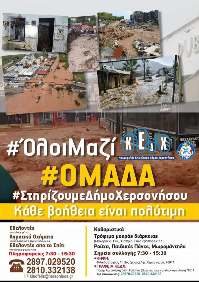 Ο Δήμος Χερσονήσου και η Κοινωφελής Επιχείρηση (Κ.Ε.Δ.Χ.) απευθύνουν έκκληση σε εθελοντές για να αντιμετωπιστούν οι εκτεταμένες ζημιές σε όλο το εύρος του Δήμου λόγω των ακραίων καιρικών φαινομένων που εκδηλώθηκαν τις προηγούμενες ημέρες. Ζητείται η συνδρομή εθελοντών για καθαριότητα, εθελοντών με αγροτικά οχήματα για την απομάκρυνση φερτών υλικών, αλλά και εθελοντών από το σπίτι για πλύσιμο ρούχων κ.ά. Παράλληλα, πραγματοποιείται συλλογή ειδών πρώτης ανάγκης για τους πληγέντες από τις πλημμύρες (καθαριστικά, τρόφιμα μακράς διαρκείας, ρούχα, παιδικές πάνες, μωρομάντηλα).