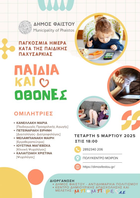 Ο Δήμος Φαιστού-Αντιδημαρχία Πολιτισμού, σε συνεργασία με το Κέντρο Δημιουργικής Απασχόλησης και Μελέτης – Μπόμπιρες Α.Ε., σας προσκαλούν σε μια ιδιαίτερα σημαντική εσπερίδα, με θέμα «Παιδιά και Οθόνες», στο πλαίσιο της Παγκόσμιας Ημέρας κατά της Παιδικής Παχυσαρκίας.