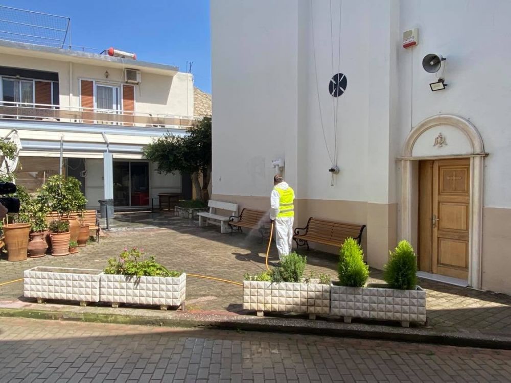 Από νωρίς η ομάδα των οδοκαθαριστών, πλυστικό πιεστικό μηχάνημα και ειδικό ψεκαστικό για απολύμανση και πρόληψη της διασποράς του Covid 19, προχώρησαν σε καθαριότητα, πλύσιμο και απολύμανση όλων των κεντρικών οδών και πεζοδρομίων, σε πλατείες, προαύλειους χώρους εκκλησιών, σχολεία, παγκάκια, καλαθάκια και κάδους.