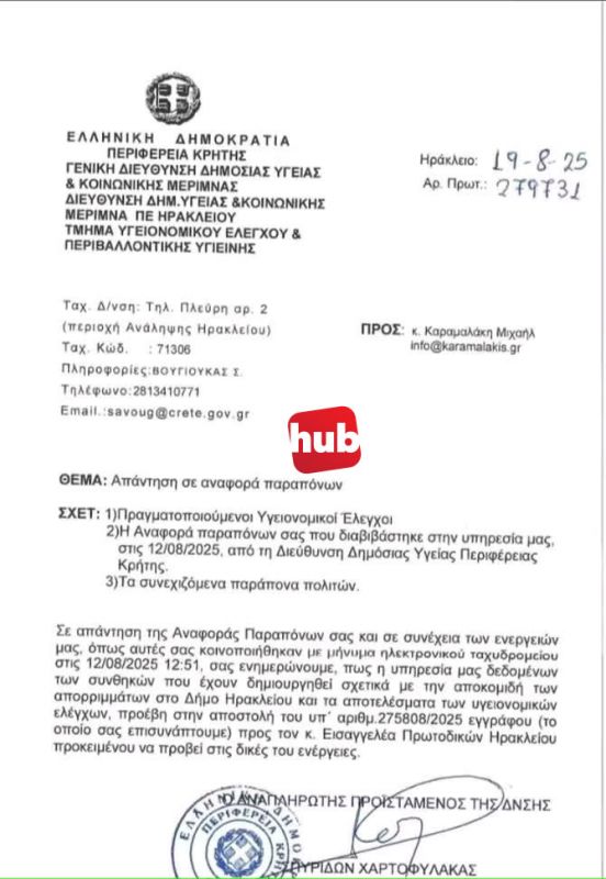 Με αυτή την απάντηση που εστάλη στις 19 Αυγούστου 2025 απο τη Διεύθυνση Δημόσιας Υγείας και Κοινωνικής Μέριμνας της ΠΕ Ηρακλείου, μπορεί κανείς να αντιληφθεί το μέγεθος του προβλήματος που καταγράφεται στο Δήμο Ηρακλείου και που βιώνουν οι δημότες.