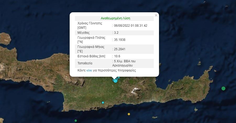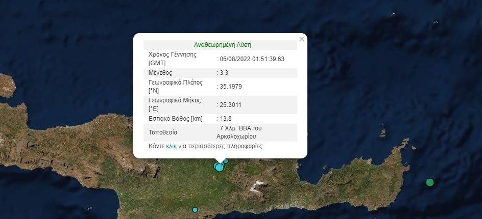 Λίγο νωρίτερα και συγκεκριμένα στις 4.01 είχαμε άλλη μια δόνηση 3,2 Ρίχτερ με επίκεντρο την περιοχή 5 χιλ ΒΒΑ του Αρκαλοχωρίου και εστιακό βάθος στα 10,6 χιλ.