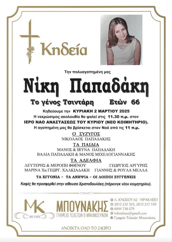 Η κηδεία της θα γίνει αύριο Κυριακή 2 Μαρτίου στις 11.30 το πρωί στο νέο Κοιμητήριο Ηρακλείου.