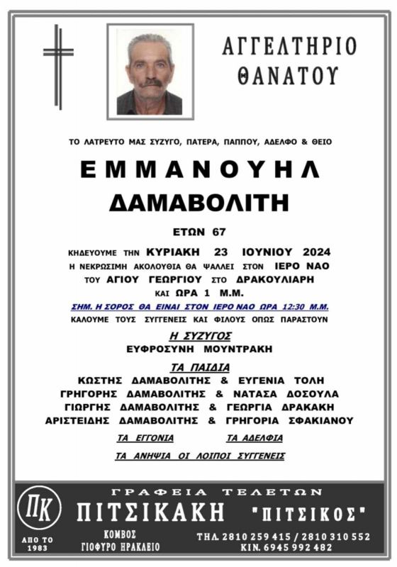 Συγκεκριμένα η νεκρώσιμος Ακολουθία θα τελεστεί αύριο, στον Ιερό Ναό του Αγίου Γεωργίου στο Δρακουλιάρη, στη 1 μμ.
