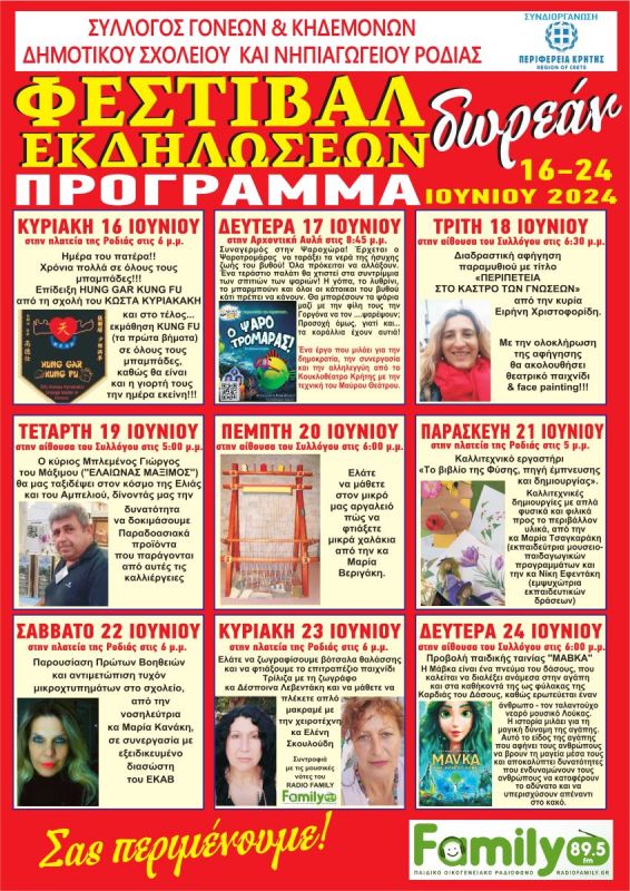 Εκδηλώσεις πραγματοποιεί ο σύλλογος γονέων και κηδεμόνων του δημοτικού σχολείου και νηπιαγωγείου Ροδιάς με την στήριξη της Περιφέρειας Κρήτης. Σύμφωνα με σχετική ανακοίνωση οι εκδηλώσεις έχουν ως εξής: