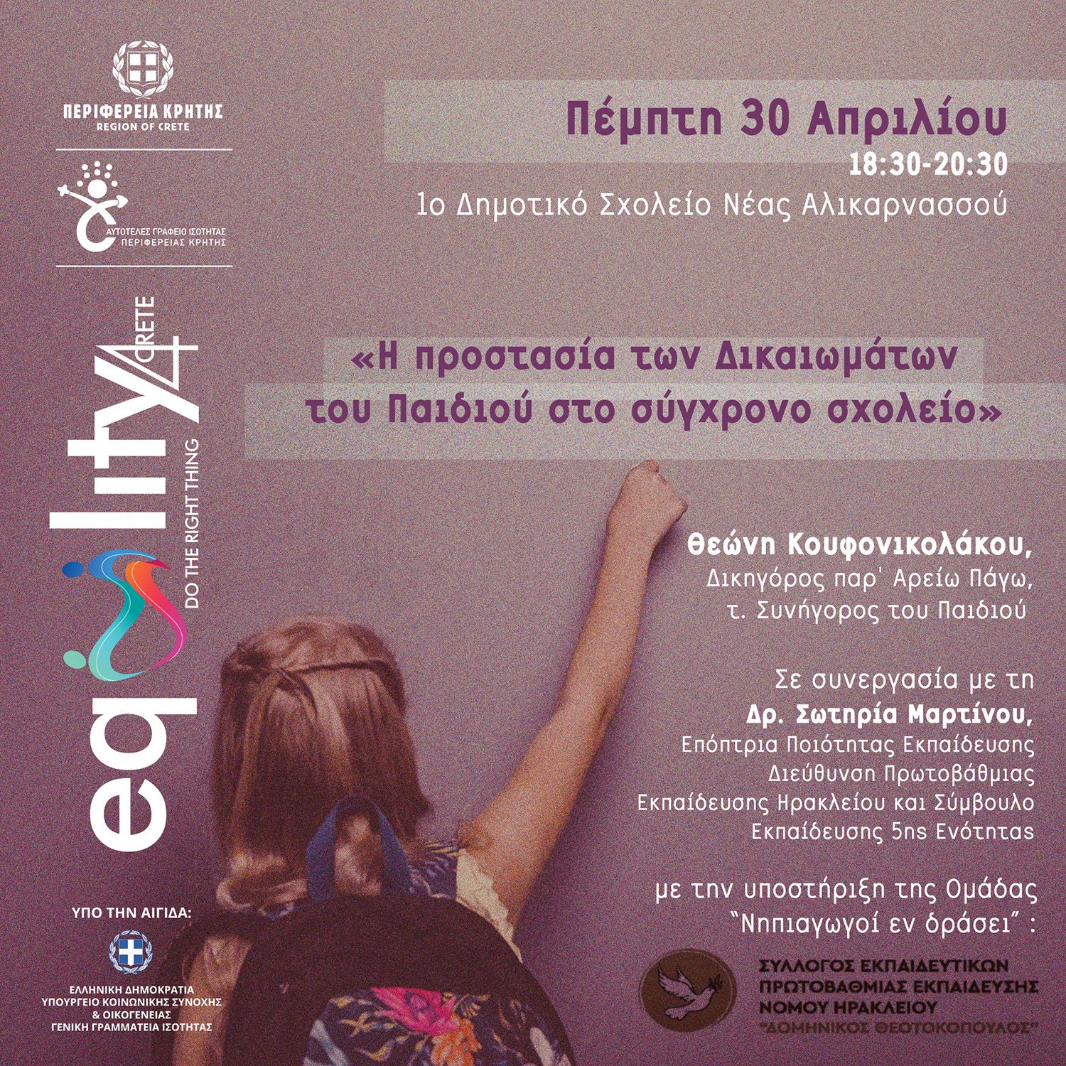 Η Περιφέρεια Κρήτης, μέσω του Αυτοτελούς Γραφείου Ισότητας, συνεχίζοντας τις δράσεις της για την προώθηση της ισότητας και των ανθρωπίνων δικαιωμάτων, διοργανώνει για 2η φορά ενημερωτική εκδήλωση με θέμα: «Η προστασία των Δικαιωμάτων του Παιδιού στο σύγχρονο σχολείο».