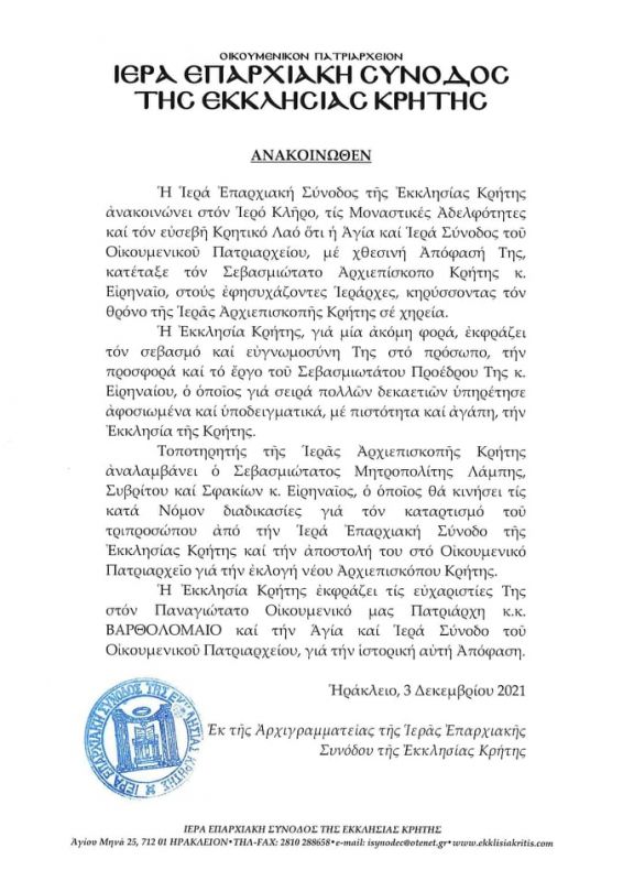 Με ανακοίνωση της προέτρεψε μάλιστα την Επαρχιακή Σύνοδο της Κρήτης να προχωρήσει στην κατάρτιση τριπροσώπου με σκοπό την εκλογή νέου Αρχιεπισκόπου, εκφράζοντας συγχρόνως τη στοργή και ευαρέσκειά της προς τον κ. Ειρηναίο: