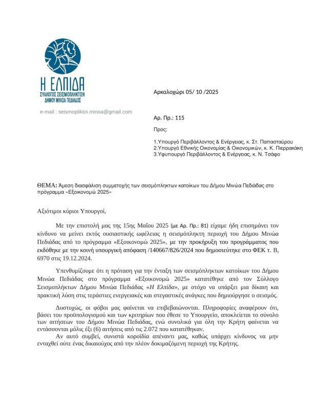 Οι Σεισμοπαθείς κάνουν λόγο για «κοροϊδία» και με επιστολή τους ζητούν από τους Υπουργούς Περιβάλλοντος & Ενέργειας, Στ. Παπασταύρου, Εθνικής Οικονομίας & Οικονομικών, Κ. Πιερρακάκη και τον Υφυπουργό Περιβάλλοντος & Ενέργειας, Ν. Τσάφο την άμεση διασφάλιση συμμετοχής των σεισμόπληκτων κατοίκων του Δήμου Μινώα Πεδιάδας στο πρόγραμμα «Εξοικονομώ 2025».