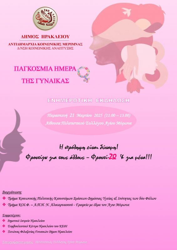 Ενημερωτική εκδήλωση με θέμα «Η πρόληψη είναι δύναμη! Φροντίζω για τους άλλους – Φροντί-ΖΩ & για μένα», διοργανώνει η Αντιδημαρχία Κοινωνικής Μέριμνας του Δήμου Ηρακλείου, την Παρασκευή 21 Μαρτίου 2025, από τις 11.00 το πρωί έως τη 13.00 μετά το μεσημέρι στην αίθουσα του Πολιτιστικού συλλόγου Αγίου Μύρωνα.