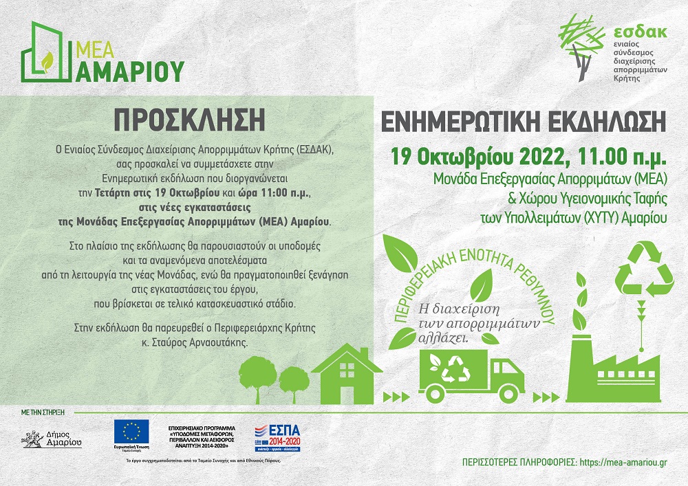 Ενημερωτική εκδήλωση οργανώνει ο ΕΣΔΑΚ στις 19 Οκτωβρίου στις νέες εγκαταστάσεις της Μονάδας Επεξεργασίας Απορριμμάτων Αμαρίου.