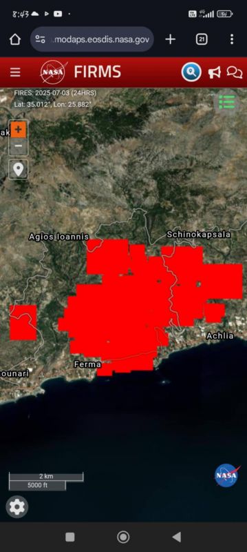 Η ενημερωμένη δορυφορική εικόνα της φωτιάς στην Ιεράπετρα καταγράφηκε από τα συστήματα παρακολούθησης του προγράμματος FIRMS (Fire Information for Resource Management System) της NASA.