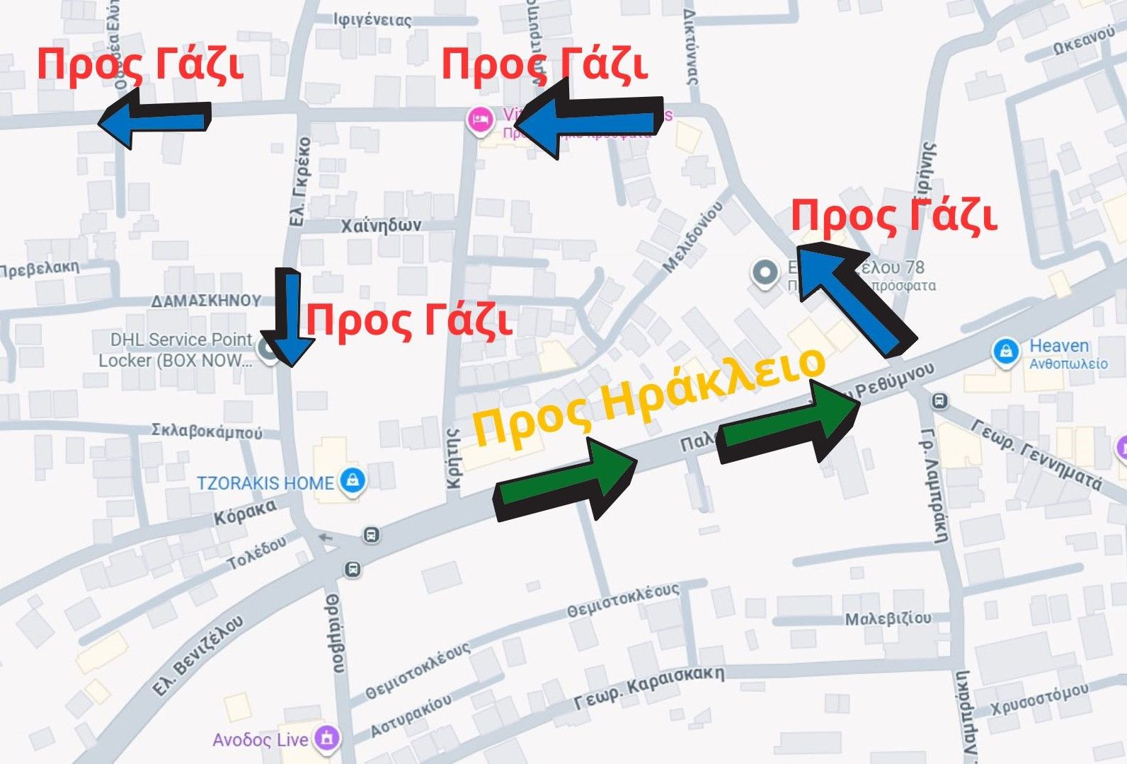 • Η Λεωφόρος Ελευθερίου Βενιζέλου μονοδρομείται με κατεύθυνση από Γάζι προς Ηράκλειο, στο τμήμα από τον κόμβο Ανόδου έως τη συμβολή της με τις οδούς Γ. Γεννηματά και Εθνικής Αντιστάσεως.