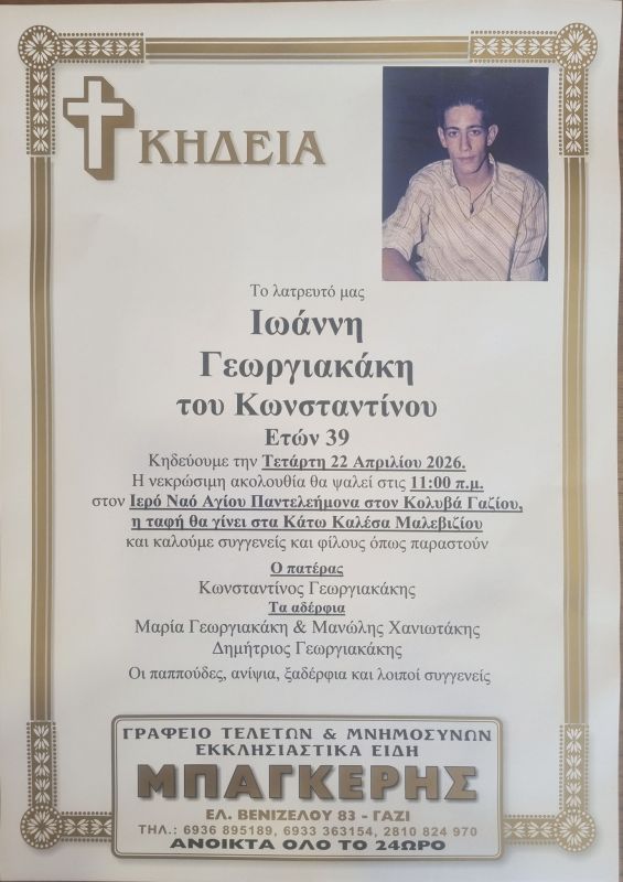 Συγγενείς και φίλοι θα τον αποχαιρετήσουν σήμερα στις 11 το πρωί από τον Ιερό Ναό του Αγίου Παντελεήμονα στον Κολυβά Γαζίου ενώ η ταφή του θα γίνει στα Κάτω Καλέσα