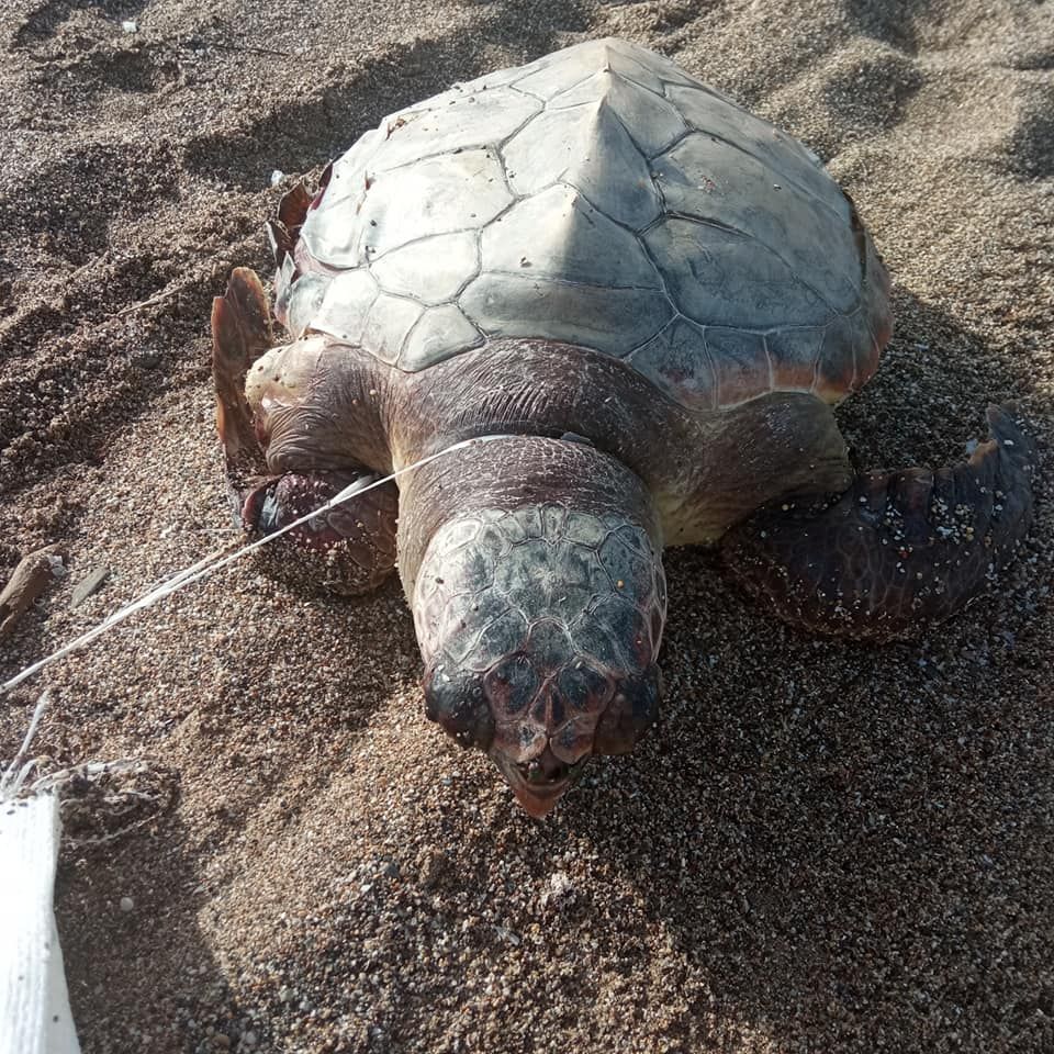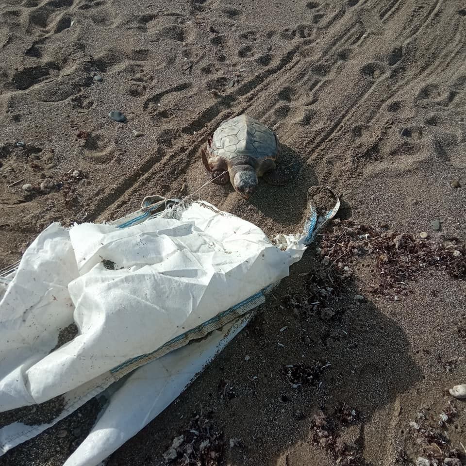 Μια νεκρή χελώνα κείτονταν στην αμμουδιά και δίπλα της ένα μεγάλο κομμάτι πλαστικού υφάσματος, απ αυτά όπου τοποθετούνται οικοδομικά υλικά χύμα. Ίνες του υφάσματος είχαν περάσει στο λαιμό και το μπροστινό πόδι της.