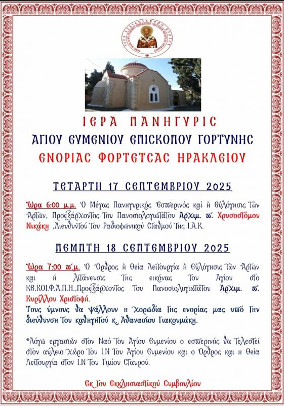 Να σημειώσουμε πως λόγω των ανακαινιστικών εργασιών που αυτή την περίοδο είναι σε εξέλιξη στον Ιερό Ναό του Αγίου Ευμενίου ο Εσπερινός θα τελεσθεί στον αύλειο χώρο του ενώ την Πέμπτη 18 του μηνός ο Όρθος και η Θεία Λειτουργία θα τελεσθούν στον Ιερό Ναό του Τιμίου Σταυρού στη Φορτέτσα.