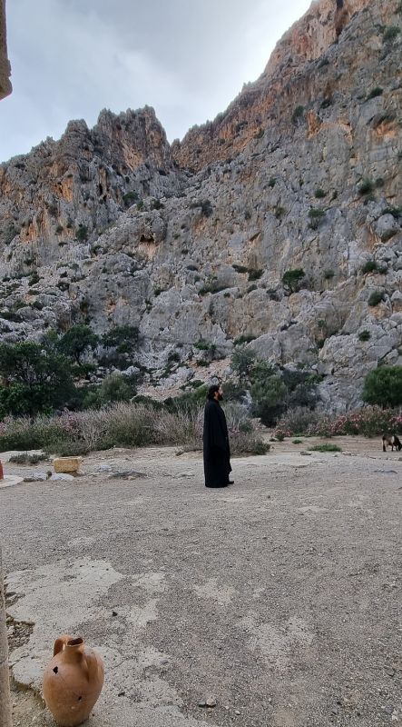 Συνοδοιπόρος μου στο φωτογραφικό οδοιπορικό ήταν ο π. Αρσένιος Προκοπάκης, αγιογράφος – ιεροδιάκονος. Ο π. Αρσένιος ως μοναχός ερημίτης του Αγιοφάραγγου ανεβαίνει στο σπήλαιο που βρίσκεται στο βράχο κι εγώ απλά παρατηρώ τις κινήσεις της ανάβασης ως κορυφαία προσπάθεια του ανθρώπου να φτάσει στο Θείο.