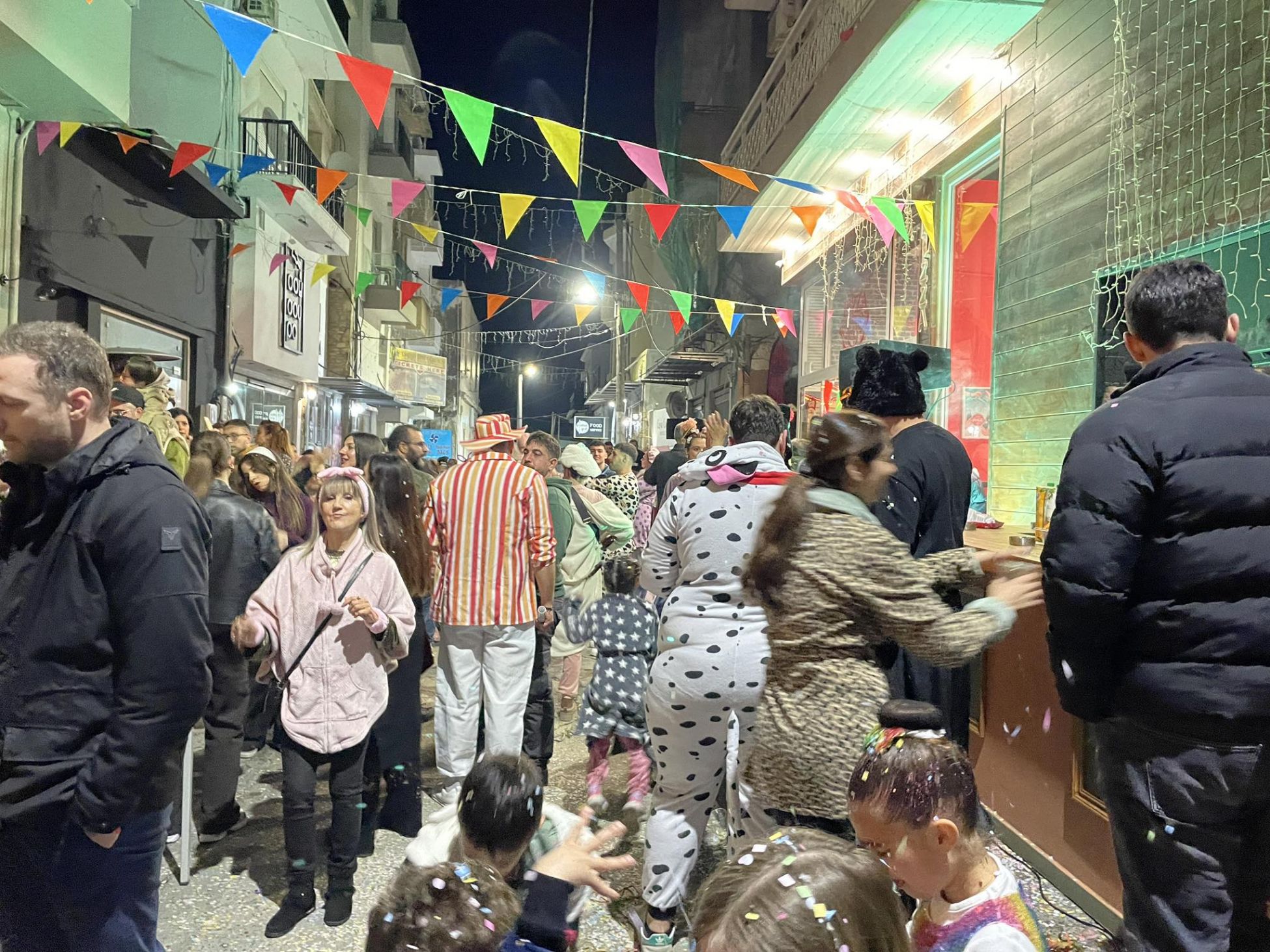 Τα παιδιά διασκεδάζουν με τις αγαπημένες τους ολόσωμες στολές, ενώ οι μεγαλύτεροι δεν δίστασαν να επιστρατεύσουν ρόμπες, νυχτικά και παντόφλες, αποδεικνύοντας πως η καλή διάθεση δεν γνωρίζει ηλικία. Η μουσική δίνει τον ρυθμό και ο χορός καλά κρατεί, δημιουργώντας μια μοναδική ατμόσφαιρα που προμηνύει μια αξέχαστη νύχτα.
