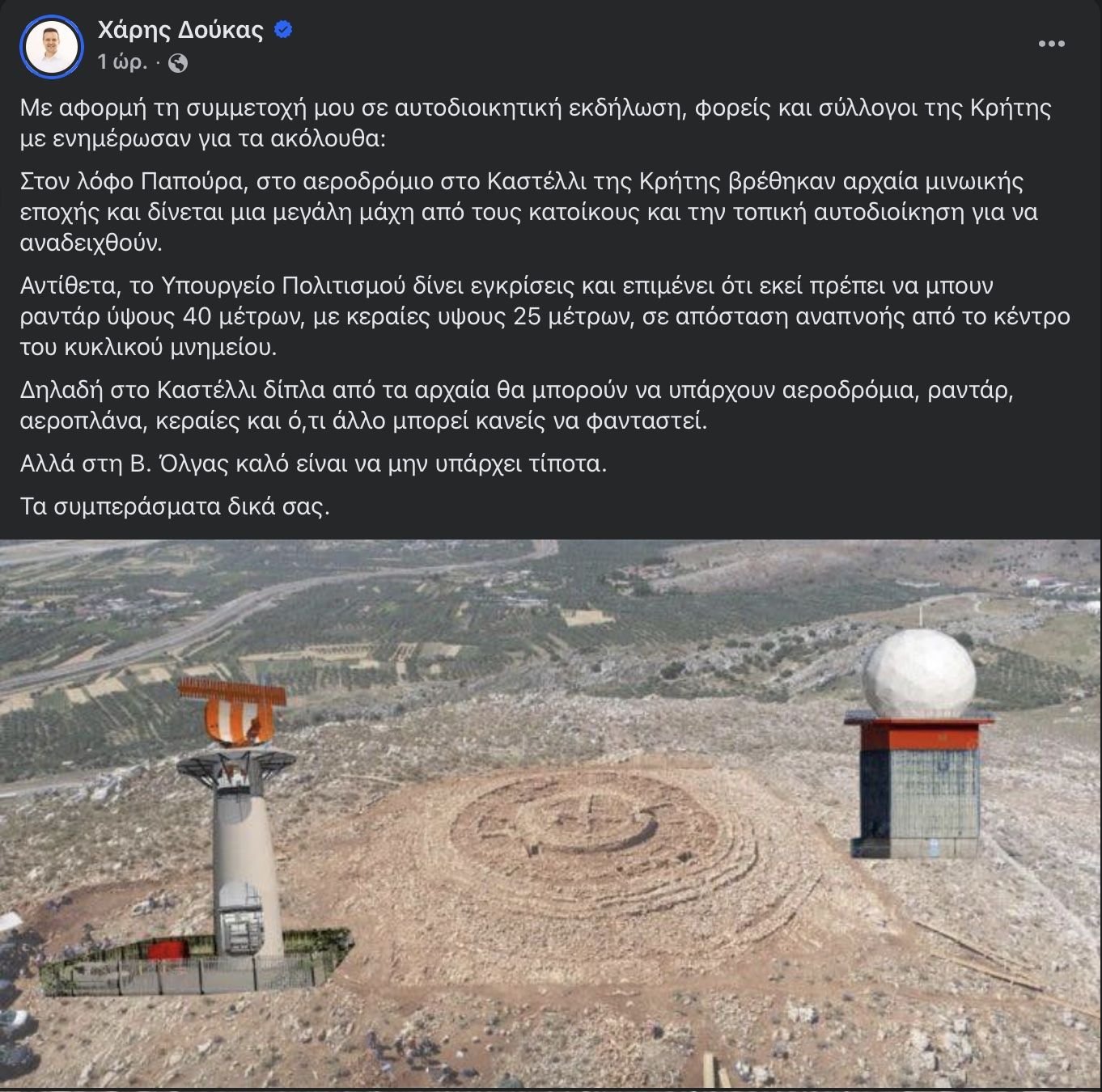 «Με αφορμή τη συμμετοχή μου σε αυτοδιοικητική εκδήλωση, φορείς και σύλλογοι της Κρήτης με ενημέρωσαν για τα ακόλουθα: