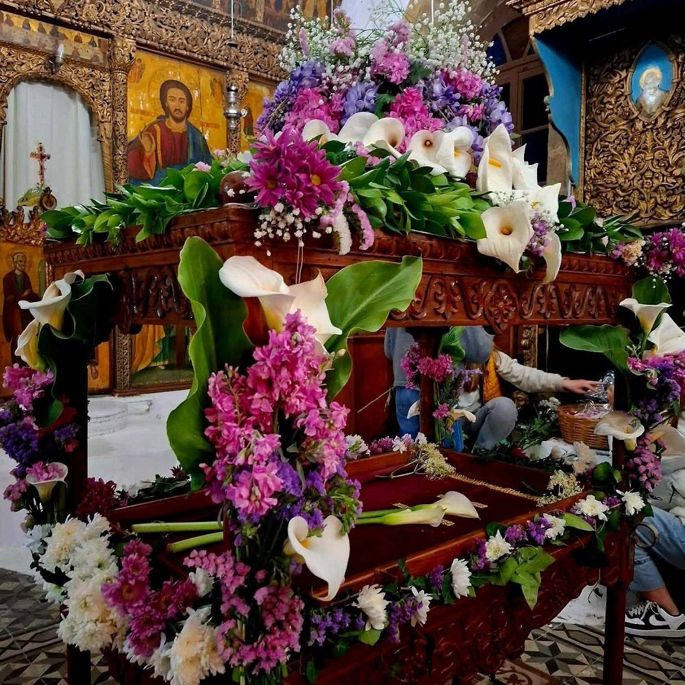 Γυναίκες και παιδιά συγκεντρώνονται στους ναούς, κρατώντας λουλούδια της άνοιξης – από αγριολούλουδα μέχρι ευωδιαστά άνθη – για να στολίσουν τον Επιτάφιο. Με μεράκι και φροντίδα, δημιουργούν μικρά έργα τέχνης που αποτυπώνουν την παράδοση, την πίστη αλλά και την αισθητική κάθε τόπου.