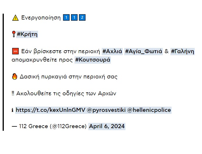 Ειδικότερα μήνυμα από το 112 για να εκκενώσουν προληπτικά τους οικισμούς πήραν οι κάτοικοι σε Μαύρο Κόλυμπο, Αχλιά, Αγία Φωτιά και Γαλήνη οι οποίο κλήθηκαν να κινηθούν προς τον Κουτσουρά.