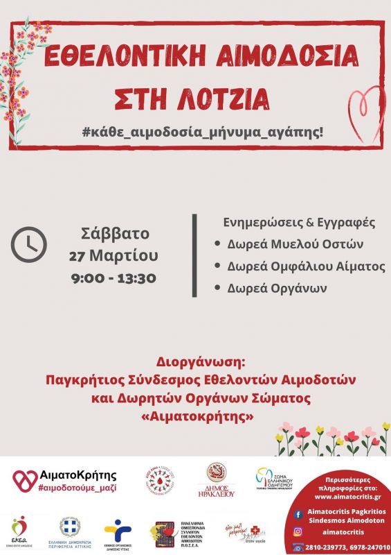 Εθελοντική Αιμοδοσία θα πραγματοποιηθεί το Σάββατο 27.03.2021 στο κέντρο της πόλης του Ηρακλείου (στο Αίθριο της Λότζια), από τις 09:00 έως τις 13:30.