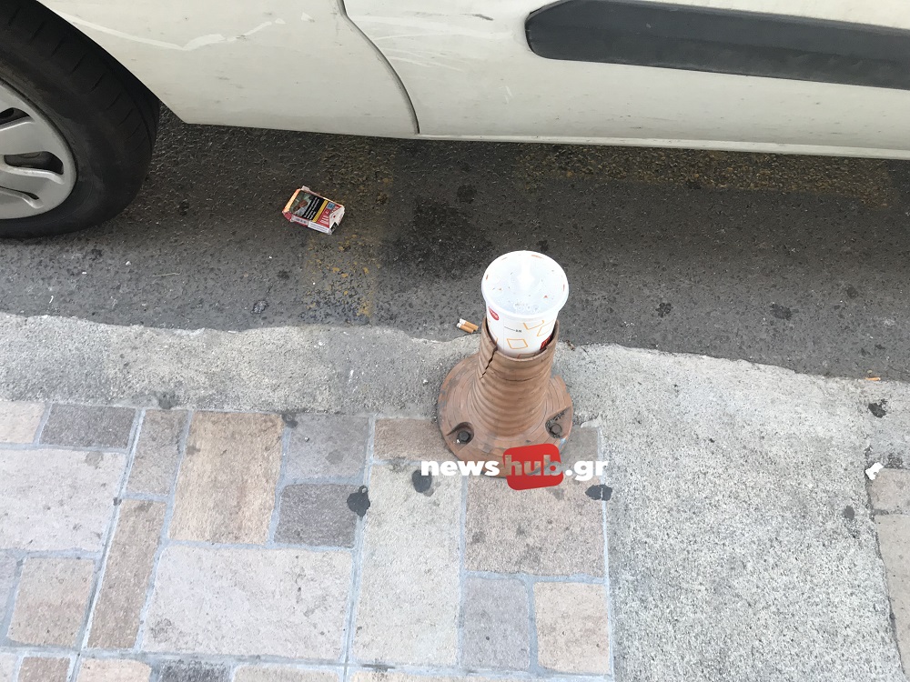 Κι όπου τα κολωνάκια δεν έσπασαν από χαμηλά αλλά λίγο πιο ψηλά, πάλι δεν έμειναν ανεκμετάλλευτα αφού έγιναν βάσεις για κυπελάκια καφέ που ορισμένοι δεν ήθελαν να ψάξουν κάδο για να τα πετάξουν