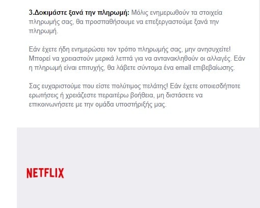 3.Δοκιμάστε ξανά την πληρωμή: Μόλις ενημερωθούν τα στοιχεία πληρωμής σας, θα προσπαθήσουμε να επεξεργαστούμε ξανά την πληρωμή», αναφέρει το μήνυμα μεταξυ άλλων.